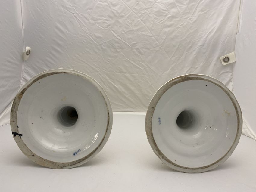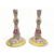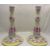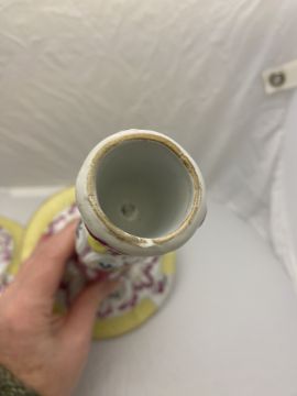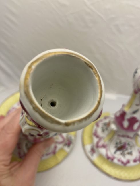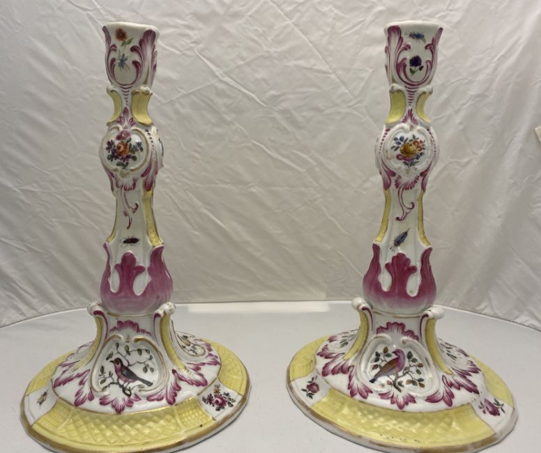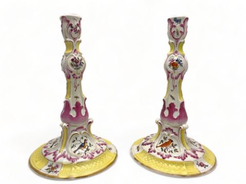 A pair of 18th century German Limbach rose, yellow and gilt porcelain candlesticks Decorated with flowers, insects and birds on circular bases, marked, each 27cm high. (2)