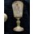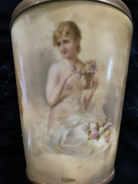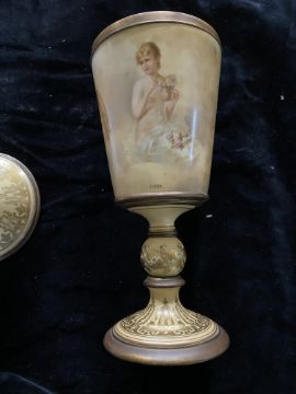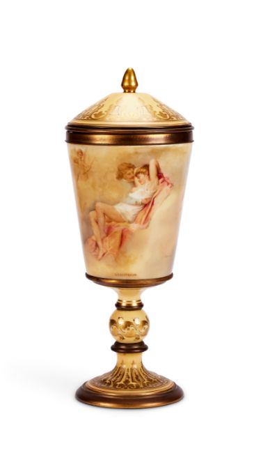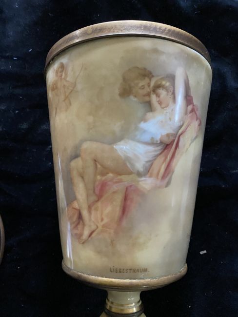 A late 19th century Vienna Porcelain and gilt bronze mounted chalice and cover titled 'Flora' and 'Liebstraum' Decorated with figures and putto on an ivory coloured ground, heightened in gilt  and applied with gilt bronze mounts, the base mount cut away to reveal the beehive mark in underglaze blue, signed indistinctly, 36.5cm high