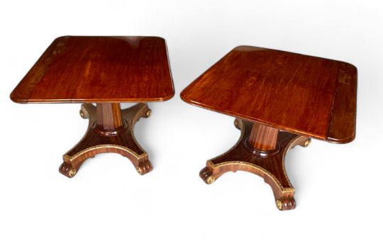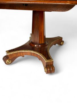 In the manner of Morel & Seddon, the rounded rectangular moulded tilting tops, with narrow ends to create two breakfast tables together with an additional central leaf; on octagonal spreading shafts and shaped quadripartite platform bases with gilt stiff leaf mouldings; on scroll feet and recessed castors, 231cm wide, 121cm deep, 73cm high.