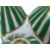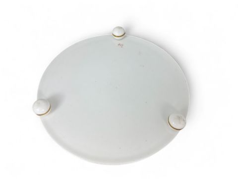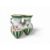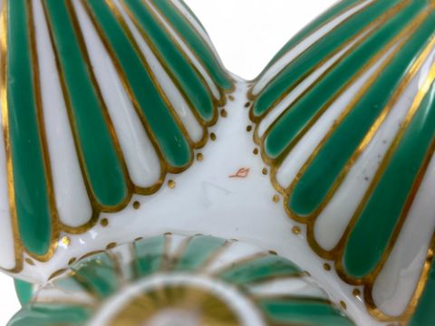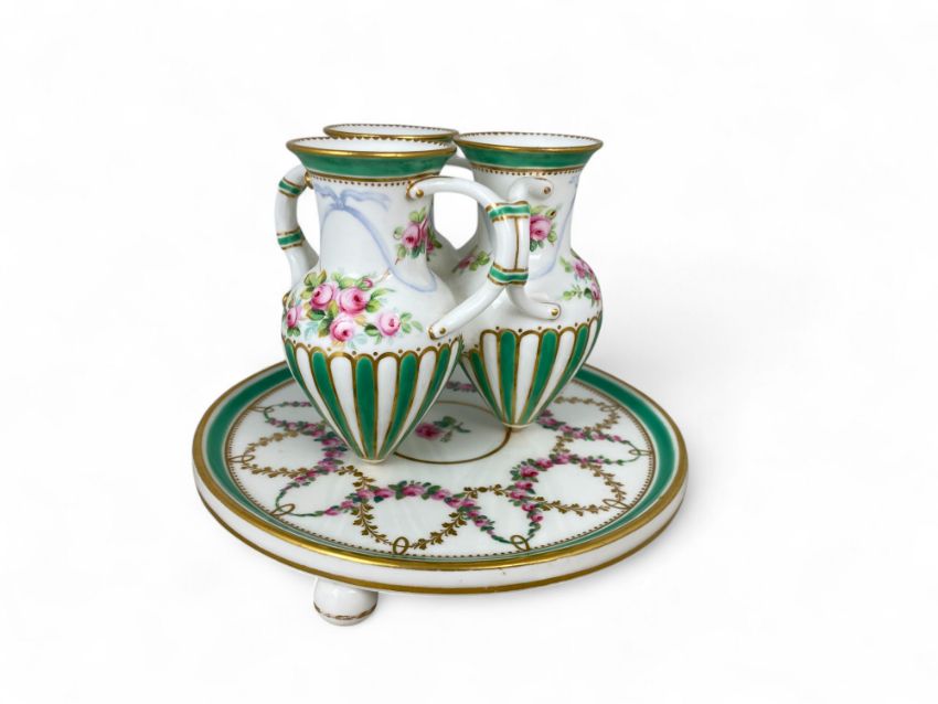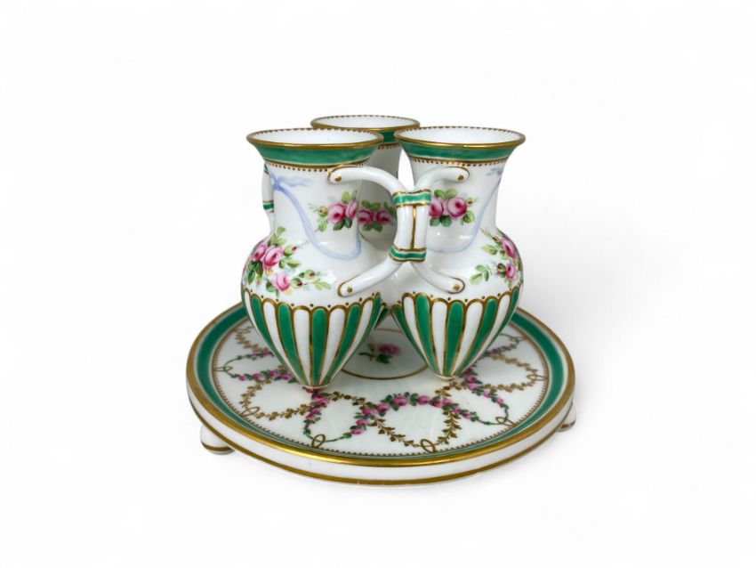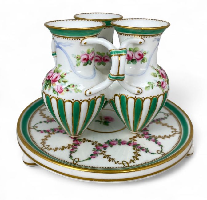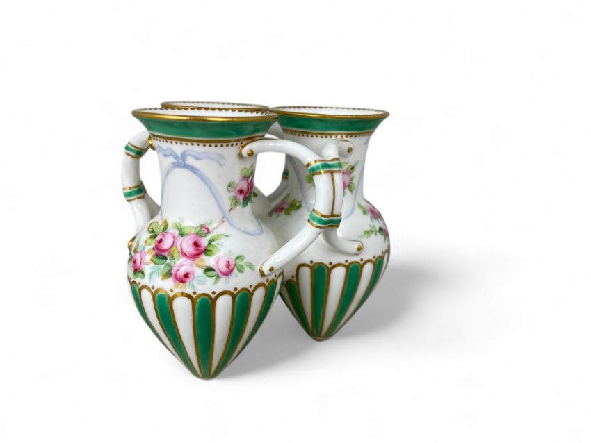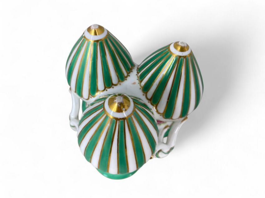 In the form of three joined Grecian ewers with gilt highlights, floral painted and with green bands, on circular stand with ball feet, impressed and painted marks, 12cm high.