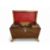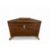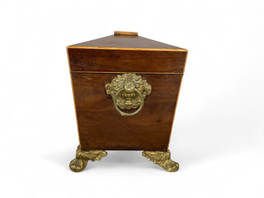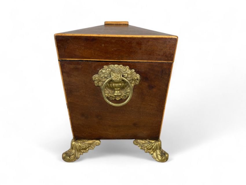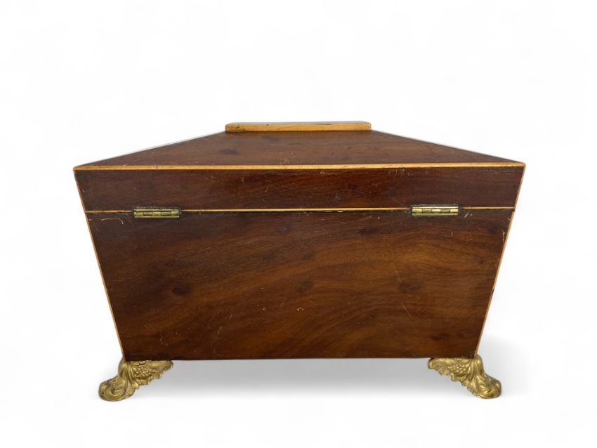 Of sarcophagus form, the hinged lid enclosing two hinged lidded canisters and a glass mixing bowl; the sides with gilt metal floral basket ring handles, on applied foliate and fruit cast feet, 30cm wide, 15cm deep, 19cm high