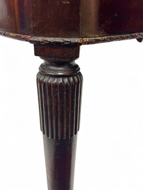 The rounded rectangular hinged top enclosing a replaced baize; on fluted and ring turned legs and spool feet, 92cm wide, 45cm deep, 76cm high.